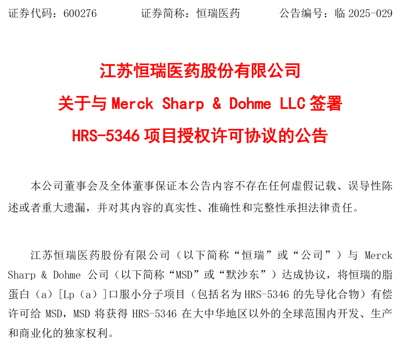 近日,恒瑞醫(yī)藥與全球醫(yī)藥巨頭默沙東就口服小分子Lp(a)抑制劑HRS-5346達成協(xié)議,該藥物在大中華區(qū)以外的全球開發(fā)、生產(chǎn)和商業(yè)化獨家權(quán)利已成功授權(quán)給跨國藥企默沙東,恒瑞醫(yī)藥將收取2億美元的首付款,并有資格獲得不超過17.7億美元的與特定的開發(fā)、監(jiān)管和商業(yè)化相關(guān)的里程碑付款,以及如果相關(guān)產(chǎn)品獲批上市,基于HRS-5346的凈銷售額的銷售提成。這標(biāo)志著中國本土創(chuàng)新藥研發(fā)實力再次獲得國際認可。